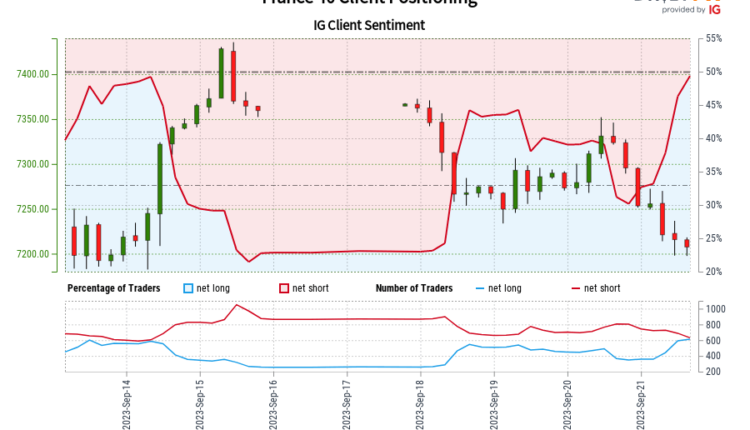 Our data shows traders are now net-long France 40 for the first time since Sep 14, 2023 10:00 GMT when France 40 traded near 7,344.90. Traders are further net-long than yesterday and last week, and the combination of current sentiment and recent changes gives us a stronger France 40-bearish contrarian trading bias.