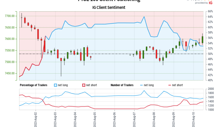 Our data shows traders are now net-short FTSE 100 for the first time since Aug 02, 2023 08:00 GMT when FTSE 100 traded near 7,548.40. Traders are further net-short than yesterday and last week, and the combination of current sentiment and recent changes gives us a stronger FTSE 100-bullish contrarian trading bias.