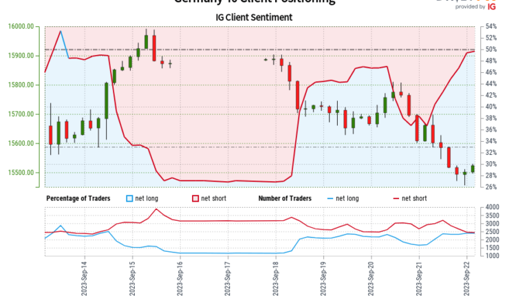 Our data shows traders are now net-long Germany 40 for the first time since Sep 14, 2023 11:00 GMT when Germany 40 traded near 15,860.10. Traders are further net-long than yesterday and last week, and the combination of current sentiment and recent changes gives us a stronger Germany 40-bearish contrarian trading bias.