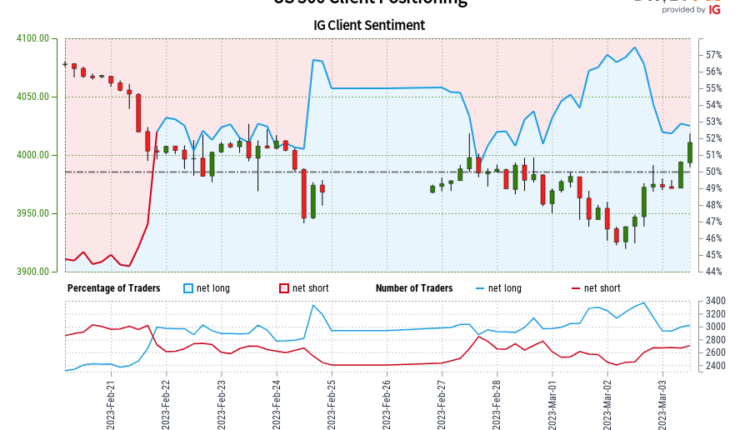Our data shows traders are now net-short US 500 for the first time since Feb 21, 2023 17:00 GMT when US 500 traded near 4,002.42. Traders are further net-short than yesterday and last week, and the combination of current sentiment and recent changes gives us a stronger US 500-bullish contrarian trading bias.
