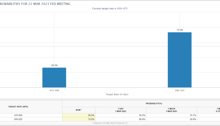 Gold has retreated from its multi week high price around $1856 as losses gained traction from Fed Chair Powell’s testimony before the Senate Committee in Washington DC. The key takeaways being a higher peak rate as well as potentially increasing the pace of hikes based on data. The probability of a 50bps rate hike is now at 73.5% for the Feds March meeting up from 29.9% a week ago.