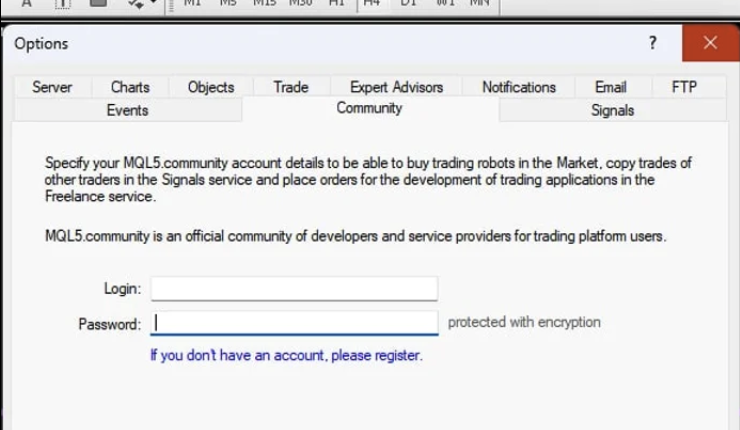 Step 1: You must log in to your MQL account in MT4/MT5 by “Tools > Options > Community”.