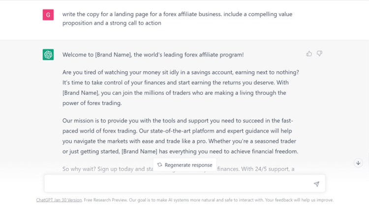 An example prompt you can use to type into ChatGPT: Write the copy landing page for a forex affiliate business. Include a compelling value proposition and a strong call to action.