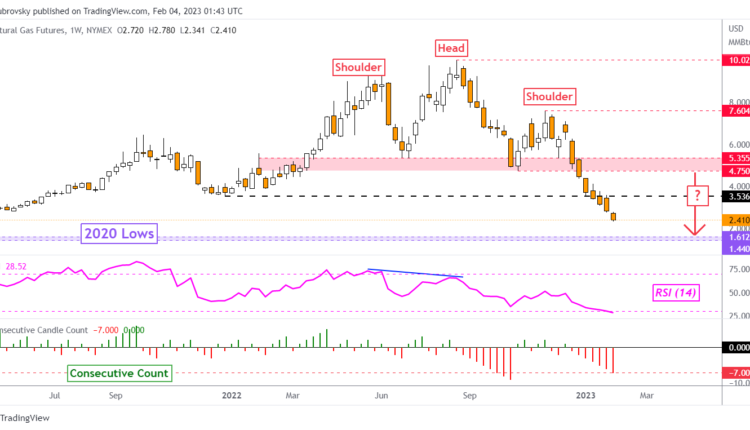 Looking at the chart below, prices are continuing lower in the direction of the bearish Head & Shoulders implied target. If natural gas follows the outlook of the chart formation, we could see prices reach lows from 2020. That makes for a range of support between 1.44 and 1.61. Let us take a closer look at the daily chart to see what are key levels to watch in the week ahead.