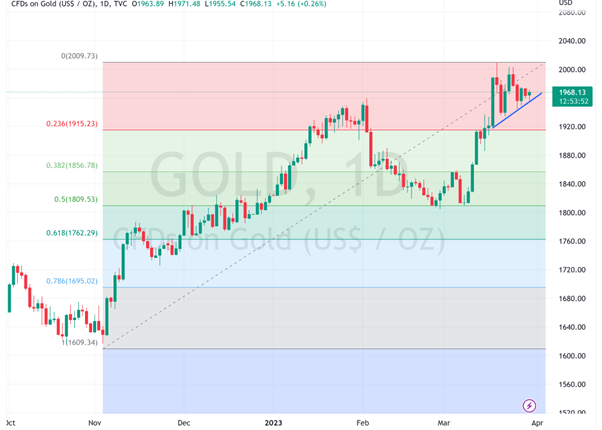 Gold prices remain pinned below the psychologically important $2000/ounce level as markets wonder how much further United States interest rates might have to rise, if at all.