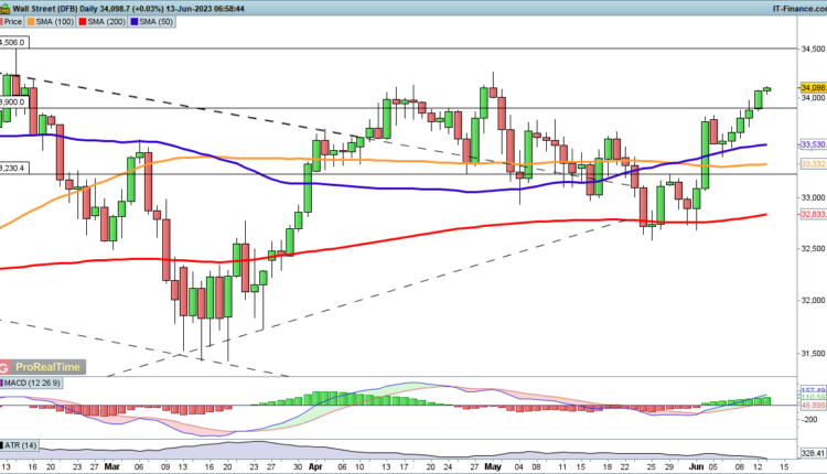 While this index is still lagging the S&P 500 and Nasdaq 100 in terms of overall performance, it is nonetheless showing fresh signs of strength. It has rallied above 34,000 and now sits at its highest level in six weeks.The April and May highs around 34,150 are the next area to watch while the May peak at 34,260 also aligns with the highs reached in February.