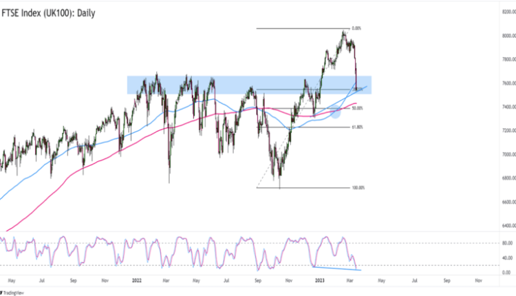 U.K.’s equities index FTSE (UK100), which already dropped sharply on Thursday and Friday, fell below the 7,600 mark and reached its two-month lows.