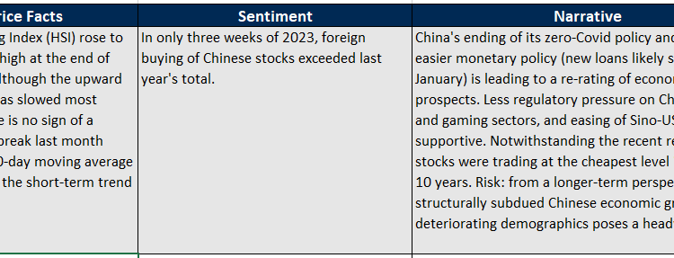 On technical charts, HSI has pulled back from stiff resistance on a horizontal line from early 2022 (at about), coinciding with the 89-week moving average. The drop below the lower edge of a rising channel from October confirms that the upward pressure has faded somewhat in the short term (somewhat because of the steepness of the channel. That is, even sideways price action can lead to a break below the channel, but it may not be necessarily bearish).