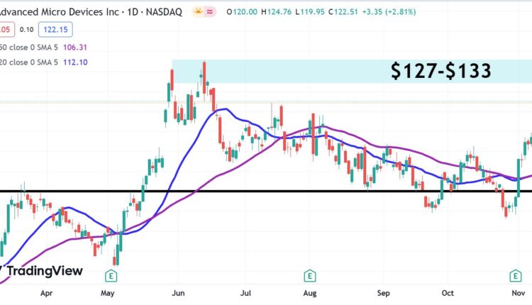 AMD stock is steadily conquering territory after beating earnings expectations at the end of October. After bottoming just above $93 in late October, AMD stock is now on pace to enter the $127 to $133 resistance zone that shunted bulls back in May and June of this year.