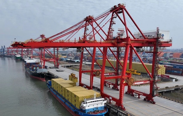 Quang cảnh cảng hàng hóa tại tỉnh Giang Tô, Trung Quốc. (Ảnh: THX/TTXVN)