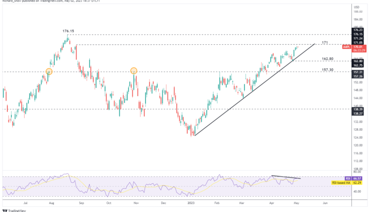 Looking at the daily chart, Apple has clearly been one of the outperformers helping drag the rest of the Nasdaq higher. However, at such elevated prices, Apple would really need to wow investors if it is going to head back towards the swing high of 176.15 without a pullback towards trendline support. Support comes in at the longer-term trendline before 162.00.
