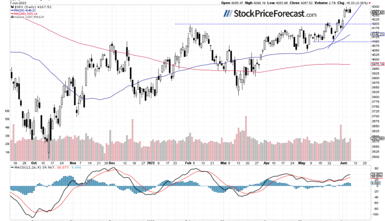 The S&P 500 index lost 0.38% on Wednesday as it continued to fluctuate below the 4,300 level following its last week’s rally. On Monday the market reached new medium-term high of 4,299.28 and it was the highest since August of 2022. Yesterday it went to the daily high of 4,299.19 before closing slightly below the 4,270 level. There is still a lot of uncertainty concerning monetary policy, the coming economic data releases, some technology stocks’ valuation, but overall, the investors’ sentiment remains bullish.