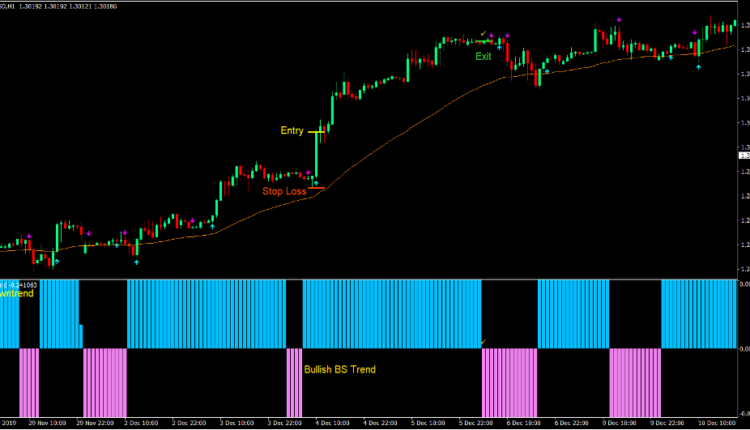- Close the trade as soon as the BS Trend indicator plots a negative bar.