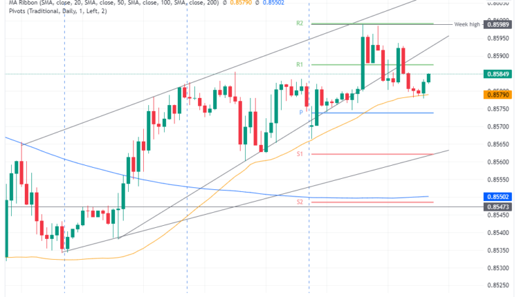 - A breach below the 50-hour SMA at 0.8579 could trigger a pullback, with potential downside targets including Monday’s low of 0.8566 and last Friday’s low of 0.8560.