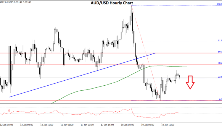 · There was a break below a key bullish trend line with support near 0.6960 on the hourly chart of AUD/USD.