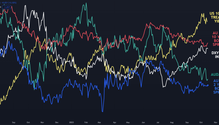 AUD/USD AND DXY (USD) INDEX AGAINST AU AND US BONDS