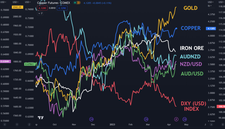 AUD/USD, NZD/USD, AUD/NZD, DXY (USD) INDEX, GOLD, COPPER, IRON ORE