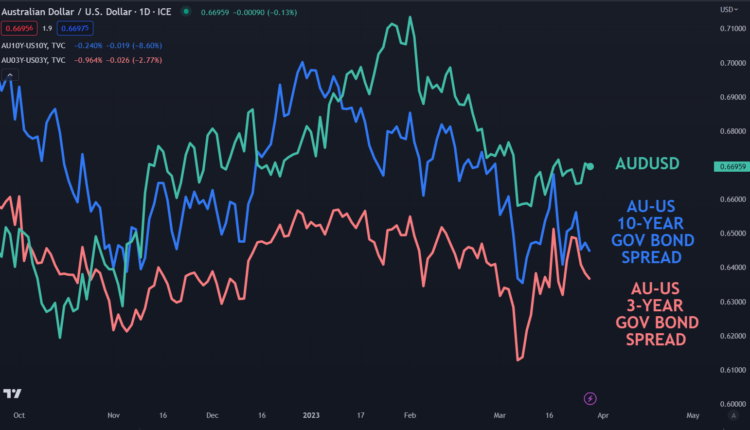 AUD/USD AGAINST 3- AND 10-YEAR AU-US BOND SPREAD