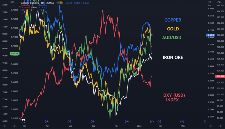 CHART – AUD/USD, COPPER, GOLD, IRON ORE (SGX), DXY (USD) INDEX