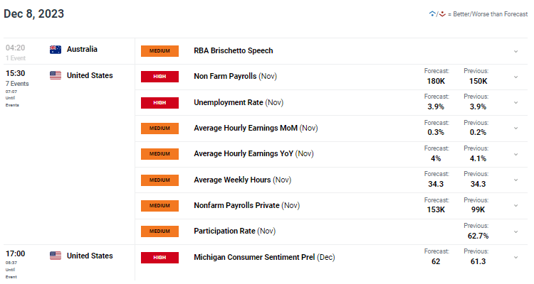 The Australian dollar followed improving risk sentiment this Friday as markets dismissed fears of the upcoming Non-Farm Payrolls (NFP) report (see economic calendar below). Misses ADP employment change and flat jobless claims could have been contributing factors but with the recent disconnect between ADP and NFP, there is still room for an NFP surprise to the upside. Weaker US consumer credit supplemented the AUD but as mentioned above, NFP will be the key driver for short-term guidance. Average earnings will be scrutinized whether or not the recent downtrend continues with the US trading session capping off with Michigan consumer sentiment data.