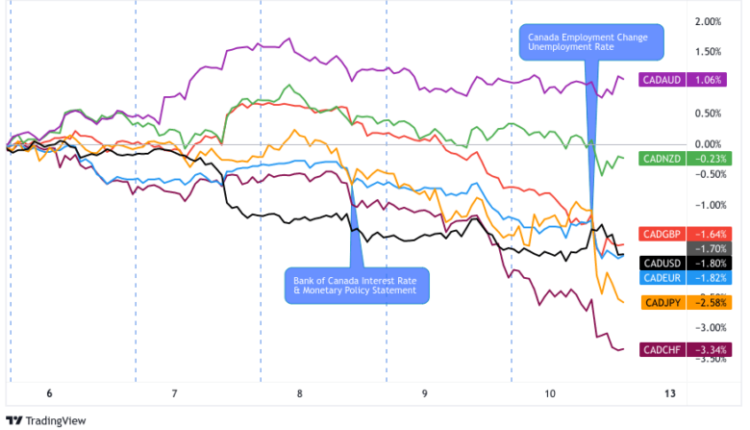 Action / results: The BOC kept interest rates on hold at 4.50% as widely expected but kept the door open for more hikes if needed. They stated that they expect their previous tightening moves to bring CPI down to their 3% target by the middle of 2023. CAD trended lower all week, likely due to the BOC pausing and on the broad risk-off environment.