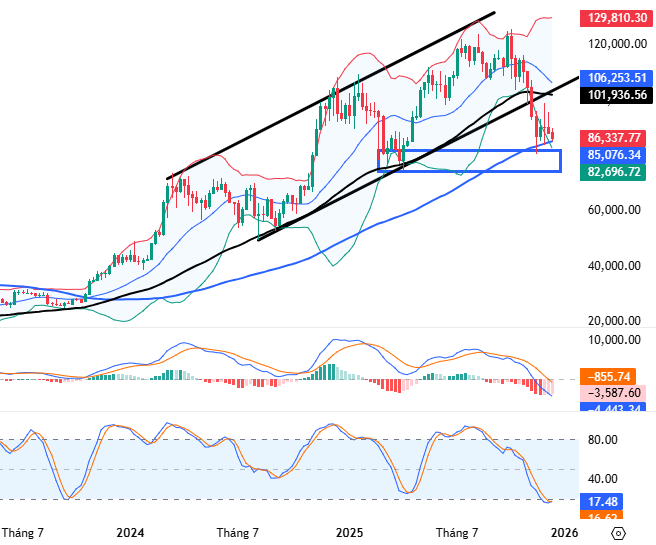 Ở khung đồ thị tuần, giá BTC diễn biến giằng co và đang kiểm tra lại đường SMA 100 tuần đồng thời là đáy cũ tháng 03/2025 (tương đương vùng 74,300-82,000 USD) sau khi phá vỡ xuống cạnh dưới của kênh giá tăng (Bullish Price Channel) dài hạn cho thấy triển vọng đang dần xấu đi.