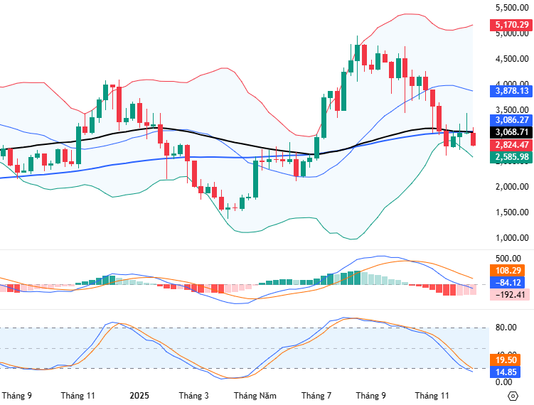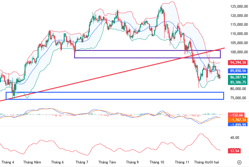 Quay trở lại khung đồ thị ngày, sau khi giá đồng tiền này phá vỡ xuống (Breakdown) đáy cũ tháng 06/2025 (tương đương vùng 97,000-101,000 USD) và hình thành một nhịp phục hồi (Pullback) về kiểm tra lại vùng này thì giá BTC đang diễn biến đi ngang với các phiên tăng giảm đan xen cùng với sự thu hẹp của dải Bollinger Bands cho thấy xu hướng giảm đang có sự chững lại trong ngắn hạn.
