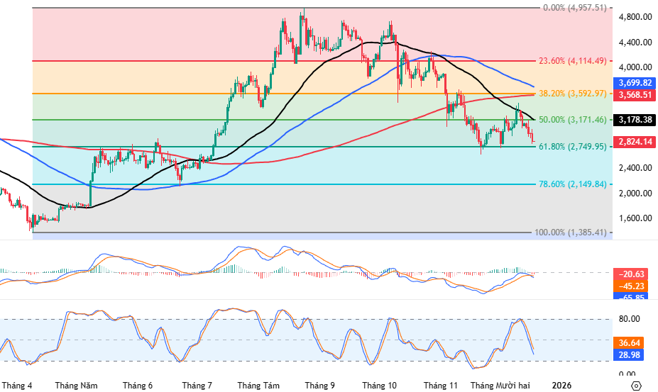 Quay lại với khung đồ thị ngày, ETH đang kiểm tra lại ngưỡng Fibonacci Retracement 61.8% (tương đương vùng 2,600-2,860 USD) sau khi xuất hiện nhịp hồi (Pullback) về kiểm tra đường SMA 50 ngày nhưng đã thất bại.