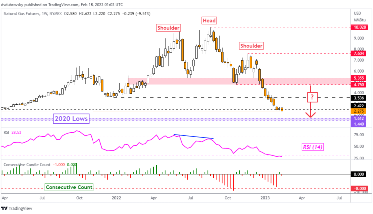 Natural gas prices continued a broader losing streak since the summer of 2022 last week. Following a brief pause on the week of February 6th, the commodity fell 9.5% over the past 5 trading sessions. Prices also confirmed a breakout under the March 2021 low. This meant the lowest close since September 2020. Moreover, it seems prices are continuing to follow the bearish trajectory of a Head & Shoulders chart formation. Is more pain ahead?