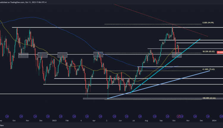 From a technical perspective, oil prices have fallen towards an important support near the $83.00 handle after Wednesday’s pullback – a key level that aligns with the 38.2% Fibonacci retracement of the 2023 rally. If the bears manage to breach this floor and push prices below trendline resistance at $82.00, we could see a drop toward $77.50.