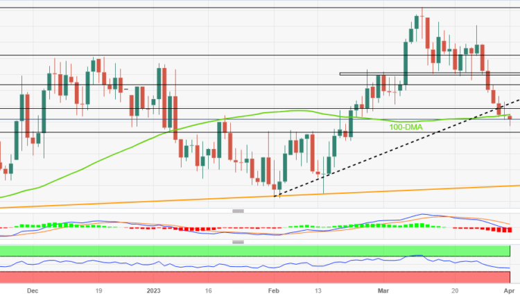 - Clear downside break of two-month-old ascending trend line, 100-DMA favor sellers.