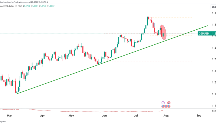 GBP/USD ended at around 1.2840 on Friday after reaching its lowest level since July 6 while investors remain concerned that the hawks will continue to circle over the Federal Reserve following the release of stronger-than-expected second-quarter Gross Domestic Product data from the US.