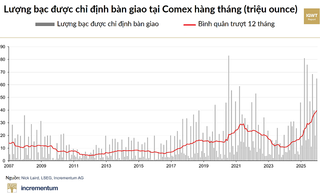 Bình quân cả năm 2025, mỗi tháng có khoảng 40 triệu ounce bạc được yêu cầu giao nhận vật chất qua sàn Comex. Riêng tháng 12 có xấp xỉ 13,000 hợp đồng, tương đương 65 triệu ounce bạc, được yêu cầu giao hàng (mỗi hợp đồng có quy mô 5,000 ounce).