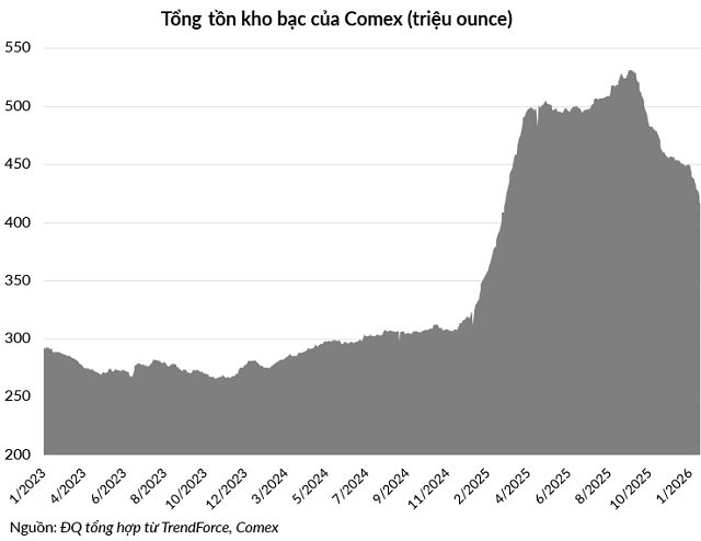 Hệ quả tất yếu là sự sụt giảm nghiêm trọng của tồn kho Comex. Chỉ trong vòng 20 ngày đầu năm, từ ngày 2/1 đến 22/01/2026, tổng lượng tồn kho (Total Inventory) đã giảm từ 449.5 triệu ounce xuống còn 416.4 triệu ounce – tức là hơn 33 triệu ounce bạc đã bốc hơi khỏi hệ thống.