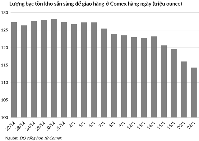 Từ 2/01 đến 22/01, tồn kho đã đăng ký giảm từ 127 xuống còn 114 triệu ounce, trong khi tồn kho đủ tiêu chuẩn giảm từ 323 xuống 302 triệu ounce.