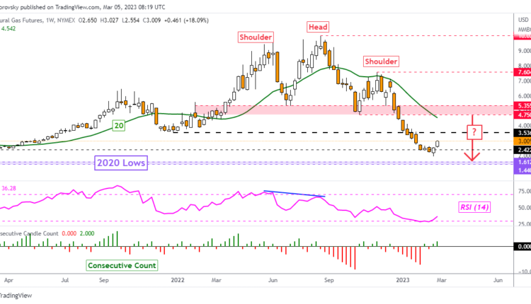 On the daily chart, natural gas has confirmed a breakout above the 20-day Simple Moving Average (SMA). Now, prices are quickly approaching the 23.6% Fibonacci retracement level at 3.2973 as well as the 50-day SMA. This will be a key area to watch in the week ahead. If resistance is reinforced, this could open the door to a turn lower toward the February low at 1.967. Otherwise, clearing resistance exposes the 38.2% level at 4.1203 before the long-term falling trendline from August comes into focus.