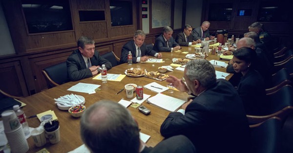 Cựu Phó Tổng thống Cheney đang nói chuyện điện thoại tại Trung tâm Điều hành Khẩn cấp của Tổng thống Mỹ. Ảnh: Nhà Trắng