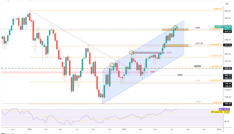 The S&P 500 continues its impressive uptrend, trading largely within the ascending channel. In recent weeks, prices have accelerated within the broader uptrend, testing the upper bound of the channel once more before pulling back at the end of last week. Once again this zone comes into focus – the zone of confluence between 4550 and the 78.6% Fibonacci retracement of the 2022 selloff (4589. In fact, this zone now appears as support as prices appear poised for another test of channel resistance around 4600/4610 as the weekly RSI edges on overbought territory.