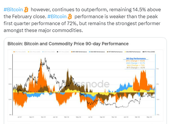 Despite a poor month of May it is important to maintain a sense of perspective. Keeping track of performance over the past 90 days and Bitcoin remains up around 14.5% from its February close. The tweet below from Glassnode shows Bitcoins performance over the past 90 days in comparison to WTI, Gold and Silver.