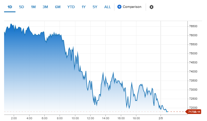 Bitcoin rớt mốc 72,000 USD trong ngày 04/02, đánh dấu ngày giảm mạnh thứ hai liên tiếp trong tuần này.