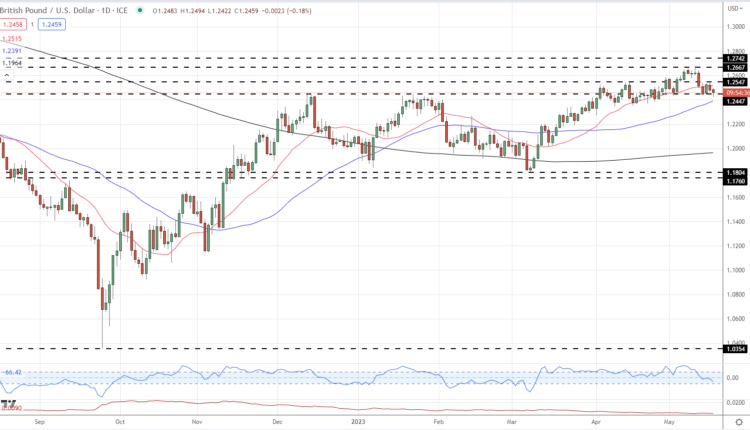 GBP/USD currently trades around a prior short-term support level at 1.2447 with additional support from the 50-day moving average just below at 1.2391. Below here is a cluster of recent lows down to 1.2350. Initial resistance is seen at 1.2547 before 1.2515 (20dma), 1.2667, and 1.2680 come into view.