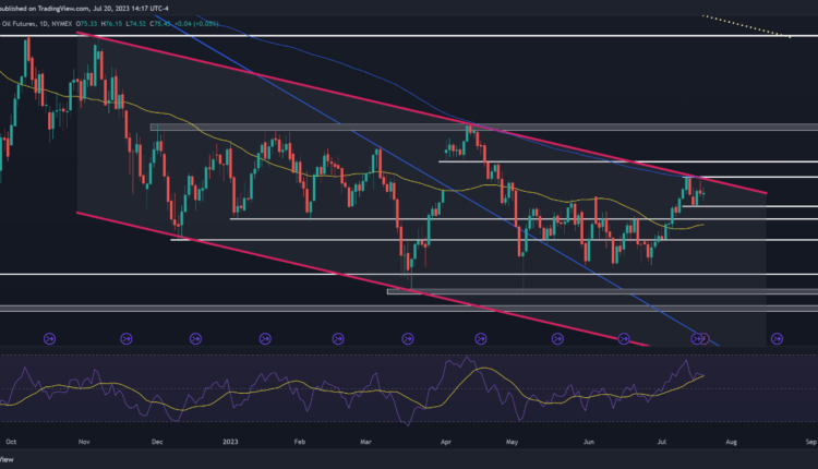 The daily chart below shows how the commodity has lacked directional conviction following the recent technical rejection, with prices swinging back and forth between ~$77.50 and ~$74.00.