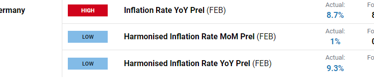 - German CPI Preliminary (Feb) unchanged at 8.7%, missing expectations of 8.5%