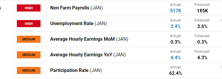 Total nonfarm payroll employment increased by 517k in January, and the unemployment rate fell to 3.4% according to the US Bureau of Labor Statistics. Hourly earnings also beat expectations. Last month’s NFP figure was also revised higher from 223k to 260k.