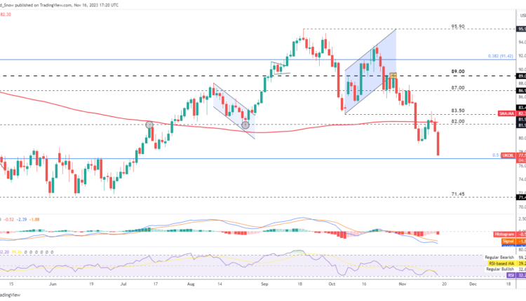 Brent now trades around the 50% Fibonacci retracement of the broader 2020 to 2022 advance and well below the $82 and psychological $80 mark. The next level of support appears all the way at $71.45 but the market is likely to enter oversold territory before nearing such a level with resistance back at $82.