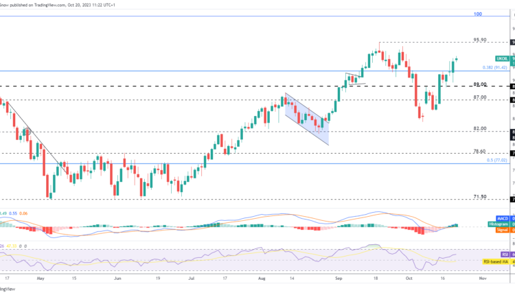 The weekly chart shows just how far oil prices can rally in the face of global crises and large-scale conflicts. The Russia-Ukraine war amplified the impressive recovery as the world reopened after forced lockdowns in response to the outbreak of Covid-19. Prices have broken above the 38.2% Fibonacci retracement of the broader Covid-inspired move from 2020 to 2022.