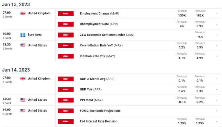 Next week’s economic data and events calendar is full of market-moving potential. Just looking at the UK, US, and Euro releases highlights that GBP/USD and EUR/GBP may get a shot of volatility, especially with the US Fed and ECB policy decisions mid-week.