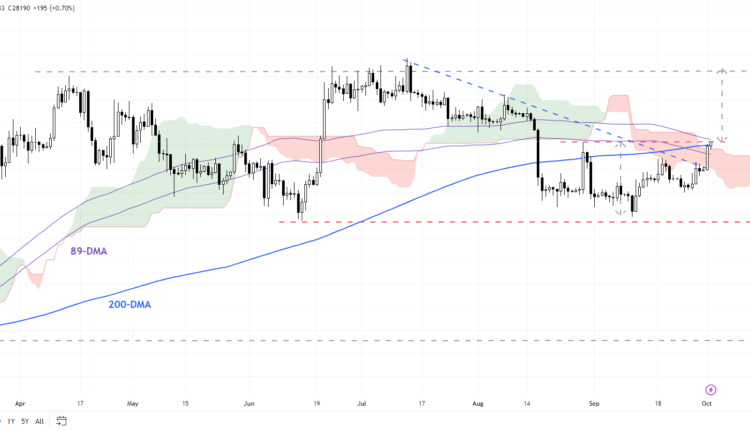 BTC/USD is now testing a key ceiling at the end-August high of 28150, coinciding with the 200-day moving average. A decisive break above could clear the path toward the July high of 31800, which could be a defining moment for Bitcoin. Any break above would not only trigger a double bottom but would reinforce the bullish medium-term trajectory, first highlighted earlier this year – see “Bitcoin Technical Outlook: BTC/USD Turns Bullish”, published January 18.