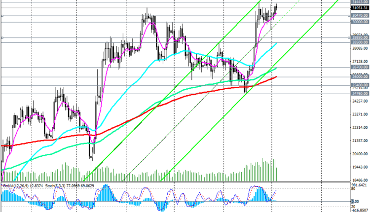 After the final breakout of the resistance levels of 30800.00, 31000.00 and the breakdown of the last week's high of 31443.00, we should expect further growth of BTC/USD towards the local maximum in 2022 of 48184.00, and then in 2021 and the mark of 69138.00.