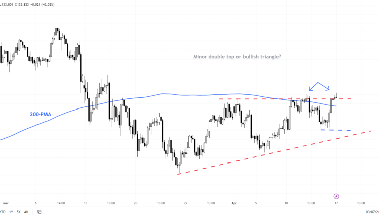 Most recently, though, USD/JPY has been stuck in a narrow range, with two potential price patterns unfolding on the 240-minute charts. One appears to be an ascending (bullish) triangle forming since late March. The other one seems to be a minor double top (the April 12 and April 17 highs). While not a done deal yet – the price action is still unfolding – the implications for the subsequent trend could differ.